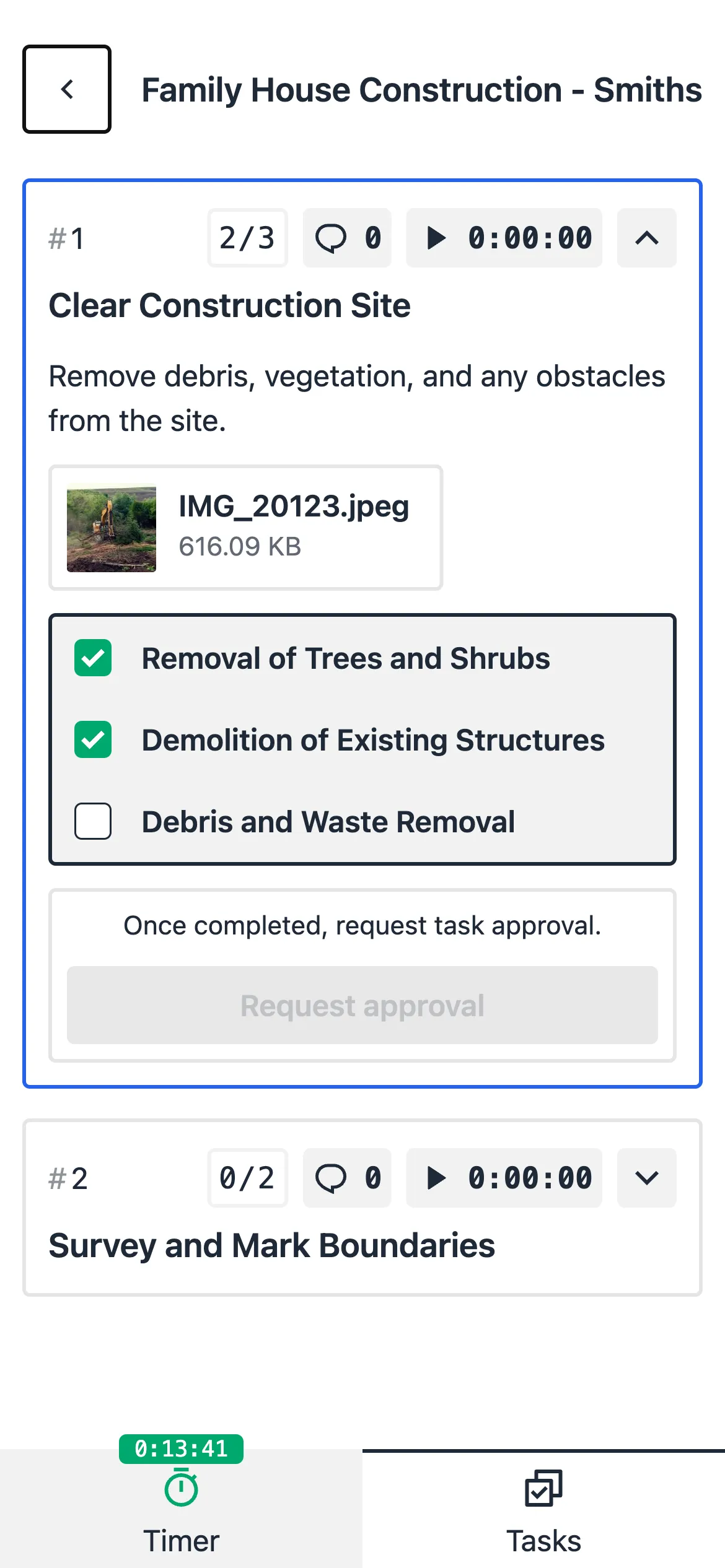 After completing a task, the worker requests task approval by pressing the Request Approval button. In the tasks section of the main application, the task will display “Approval Requested”.